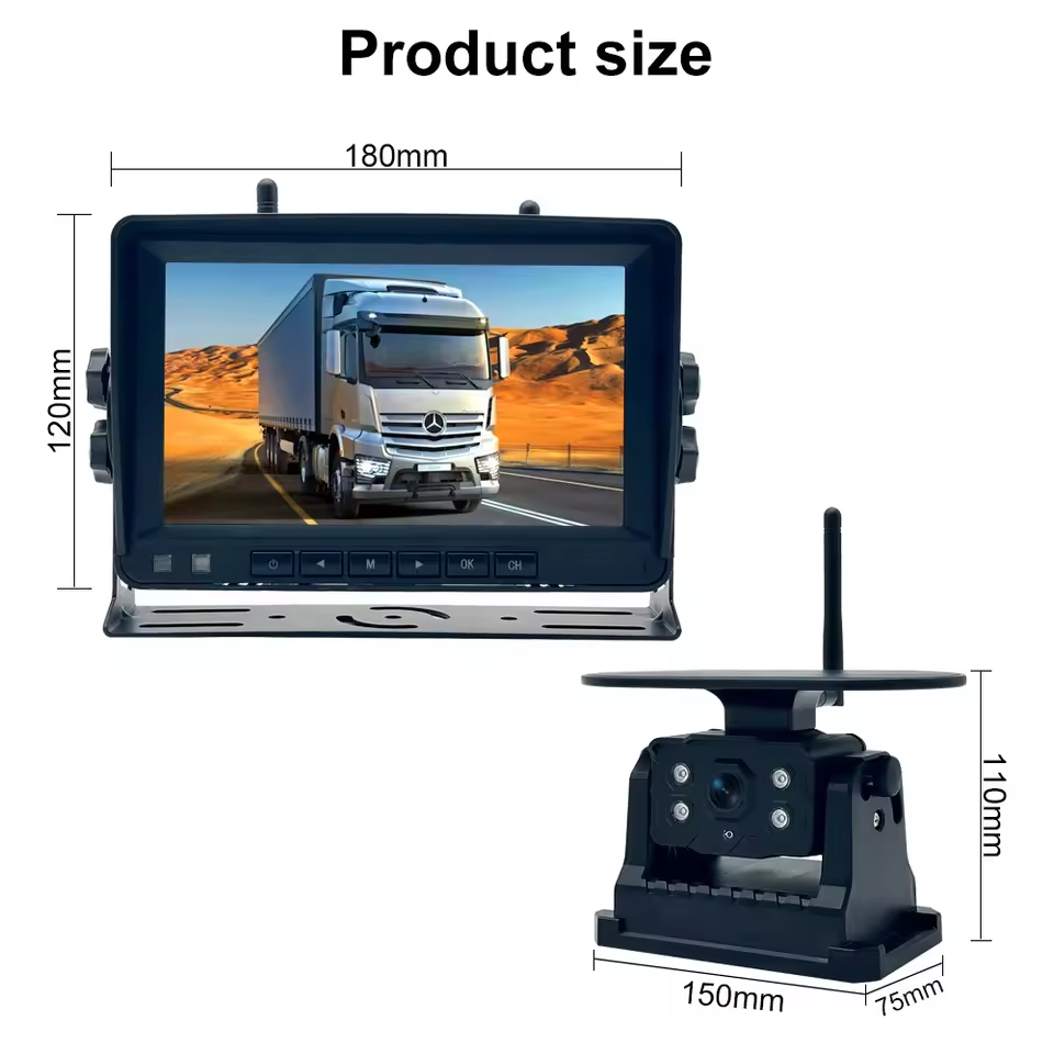 The Car Rearview Camera System with Wireless Display is specifically engineered for trucks and large vehicles, providing real-time video monitoring of the vehicle's surroundings to ensure safety while reversing or parking. With wireless connectivity, the system eliminates complex wiring, making installation quick and straightforward. The 7-inch high-definition monitor delivers clear, sharp video, while the wireless camera provides high-quality rearview footage even in demanding conditions.